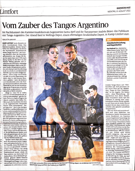 “Dabei bezauberte Sarita Apel das Publikum in ständig neue, atemberaubend schöne Kleider gehüllt, je nach Tanz mal als Andres Bravos sinnlich-frivole, dann wieder kesse, verliebte oder gänzlich unnahbare Tanzpartnerin…”